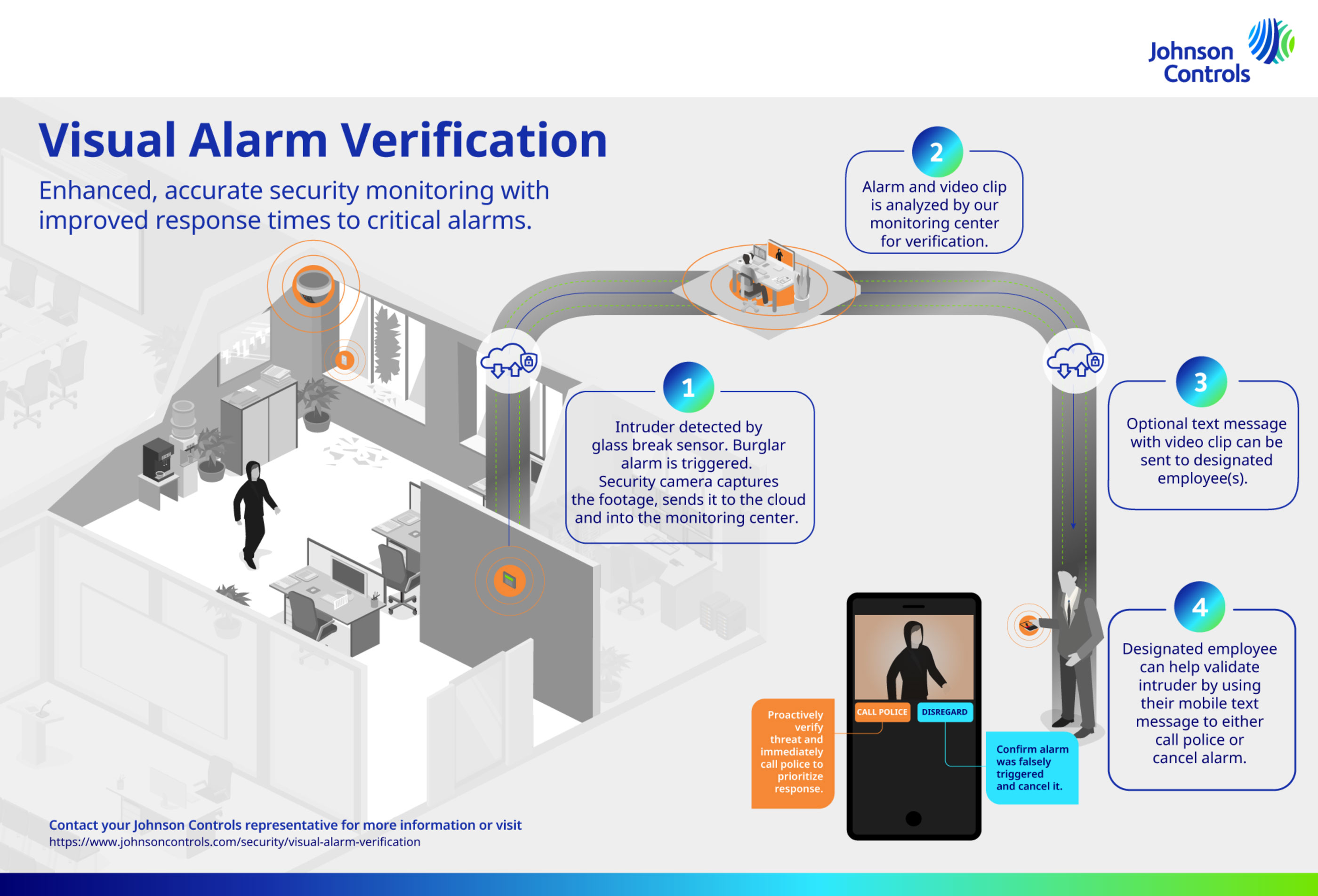 Operators are trained to wait for a response before taking any action, allowing individuals time to review text messages and video clips. If they receive no contact from the customer, our operators will follow the Standard Operating Procedures previously agreed upon between Johnson Controls and the customer.