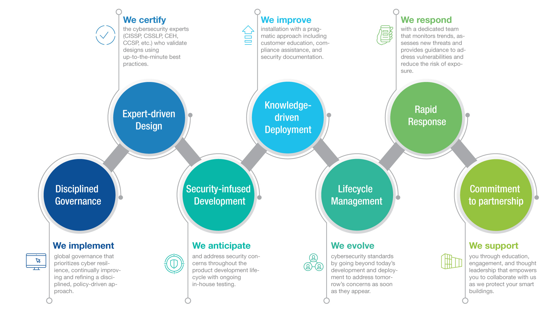 Johnson Controls provides industry-leading cyber resilience at any scale — always with the same proven approach that applies our standards-based policies and global knowledge to: